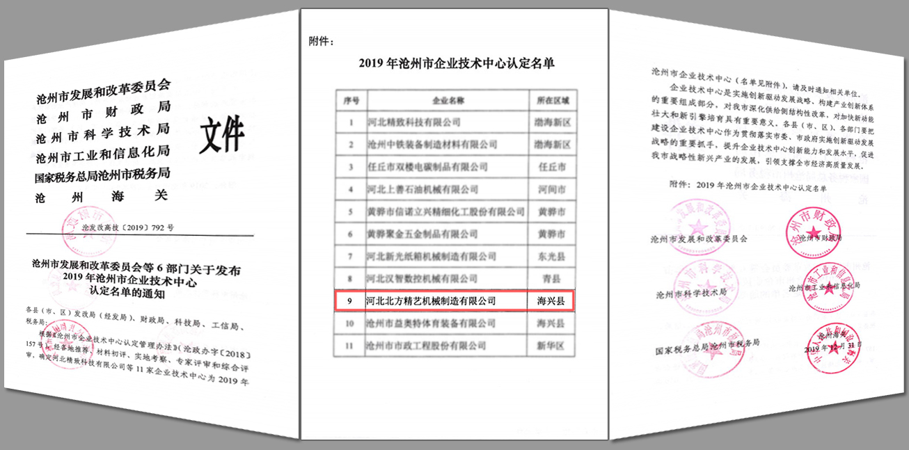 ? ? ? ? 在經過嚴格的材料評審、實地考察、專家答辯和綜合評審,河北北方精藝機械制造有限公司最終榮獲由滄州市發展和改革委員會、滄州市科學技術局、滄州市工業和信息化局等共六個部門共同認定的“滄州市企業技術中心”。
